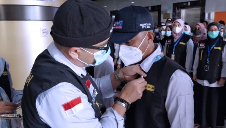 TIMES Banjarmasin/Kapuskes Haji Kemenkes Budi Sylvana saat menyematkan pin kepada petugas kesehatan haji. (FOTO: dok. Kemenkes)